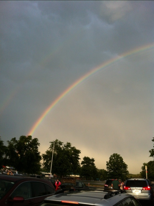 Headed home straight from dinner into a giant deluge. Stopped at the Kennebunk rest area with storm clouds to the east and sunshine to the west just as the rain was petering out. Ran in for a quick diaper and pajama change for Brady and some coffee for me. Came out to this double beauty and lots of touristy gawkers. Lovely ending to a fantastic weekend with family and friends in Maine.