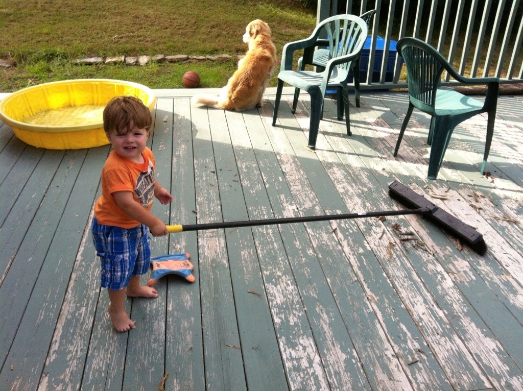 … or you could hand the kid a broom, which he’s never seen before, and set him to sweeping the porch. Brady spent half the afternoon messing about with this pushbroom: