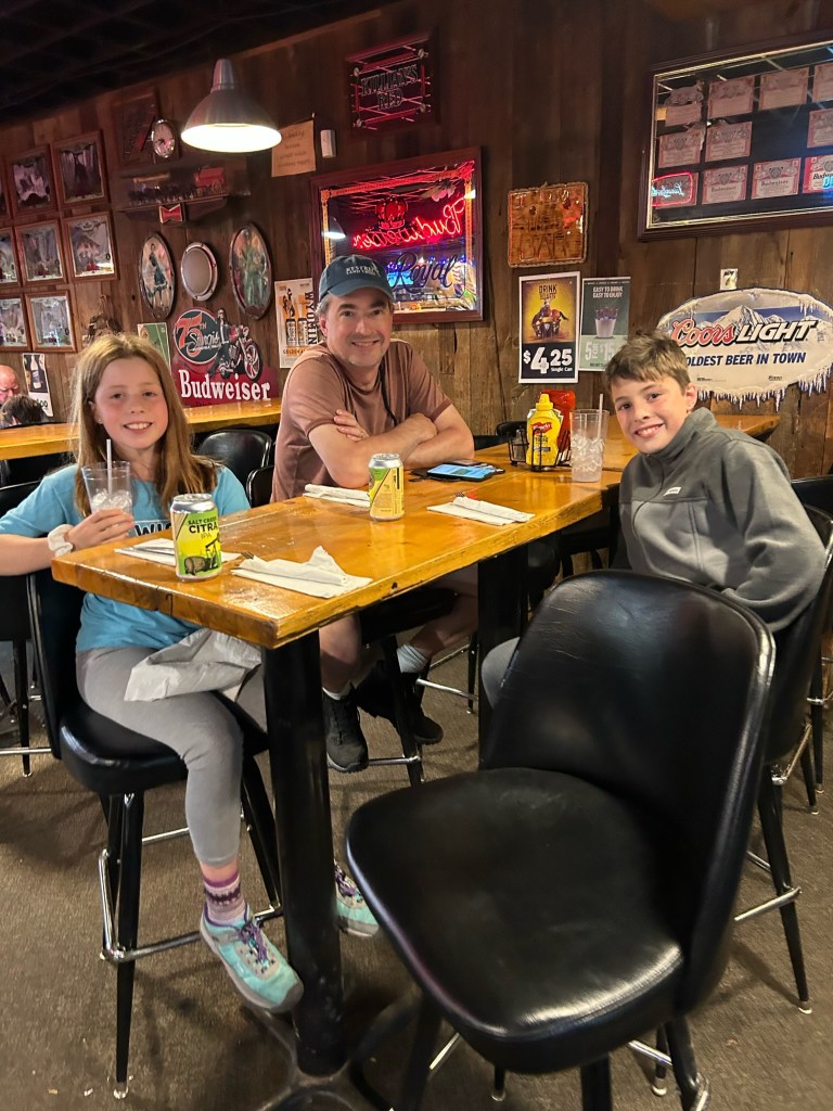 We knew we had a LONG drive to the Grand Tetons the following day so we got back on the road to kick out another 3 hours or so before bedtime. Circumstances left us eating dinner in the county seat of the least populated county in Wyoming, the least populated state in the U.S. We had found a great-sounding pizza joint, only to find it closed due to family illness. That left only one choice, a “family friendly” pub, full of smoking locals, but with really delicious 3/4 pound burgers and a decent local beer in a can.