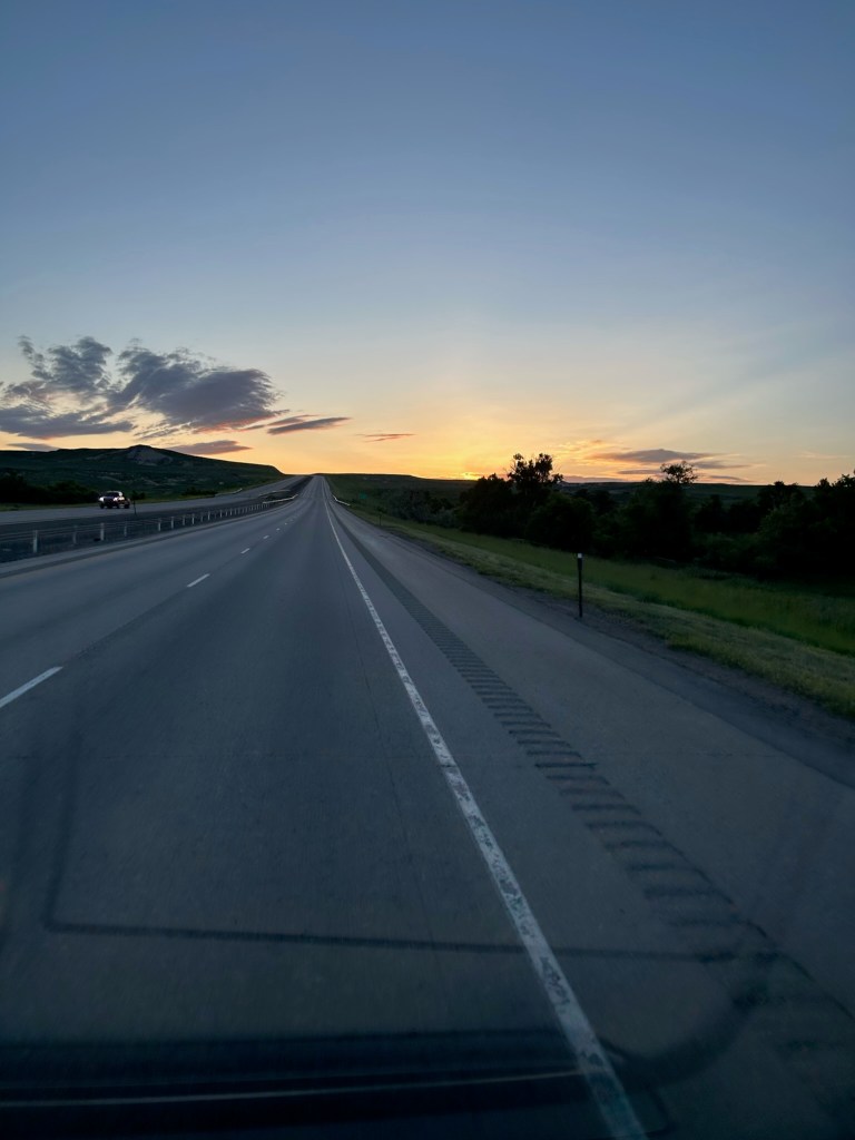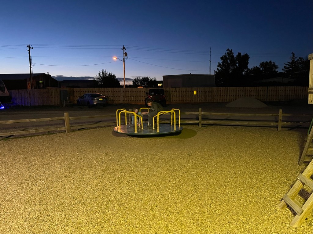 We got to see the sunset on the road and landed at a Casper, WY KOA at about 9:30pm, just in time for one quick ride on the playground spinner before bed.