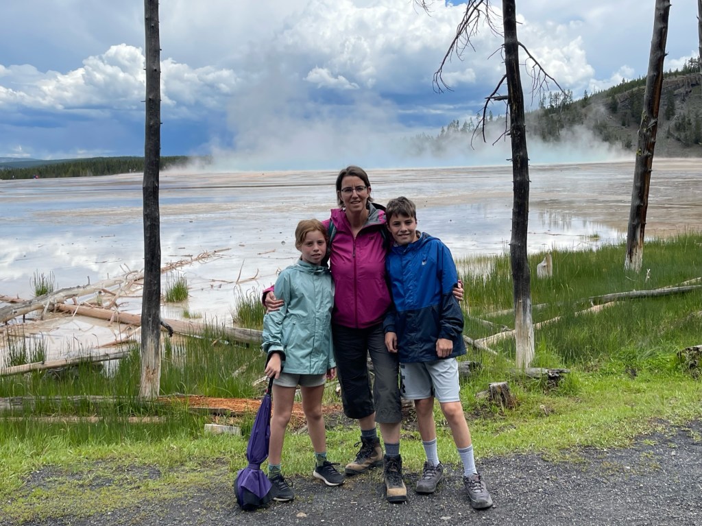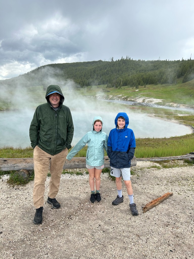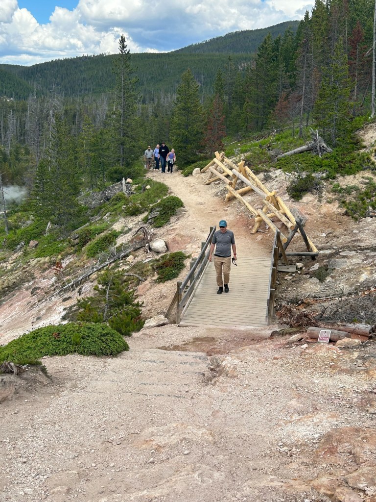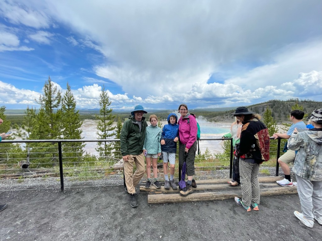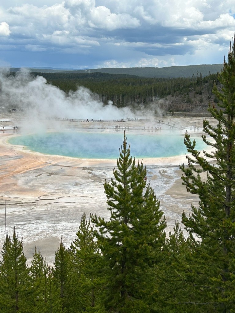 We decided to abandon our idea of hiking through the complex due to an approaching thunderstorm and chose instead to drive to Fairy Trail, where we encountered massive traffic and zero parking. We found a roadside spot at a 30 degree slope in our very tall camper in the pouring rain. We made and ate our lunch, carefully load balancing to not tip our camper over. The rain hadn’t completely abated but we hiked our way to the Grand Prismatic Overlook. The view was spectacular.