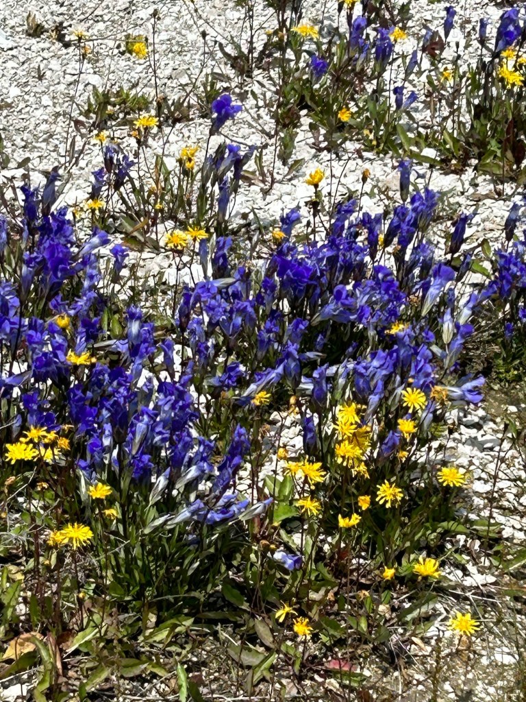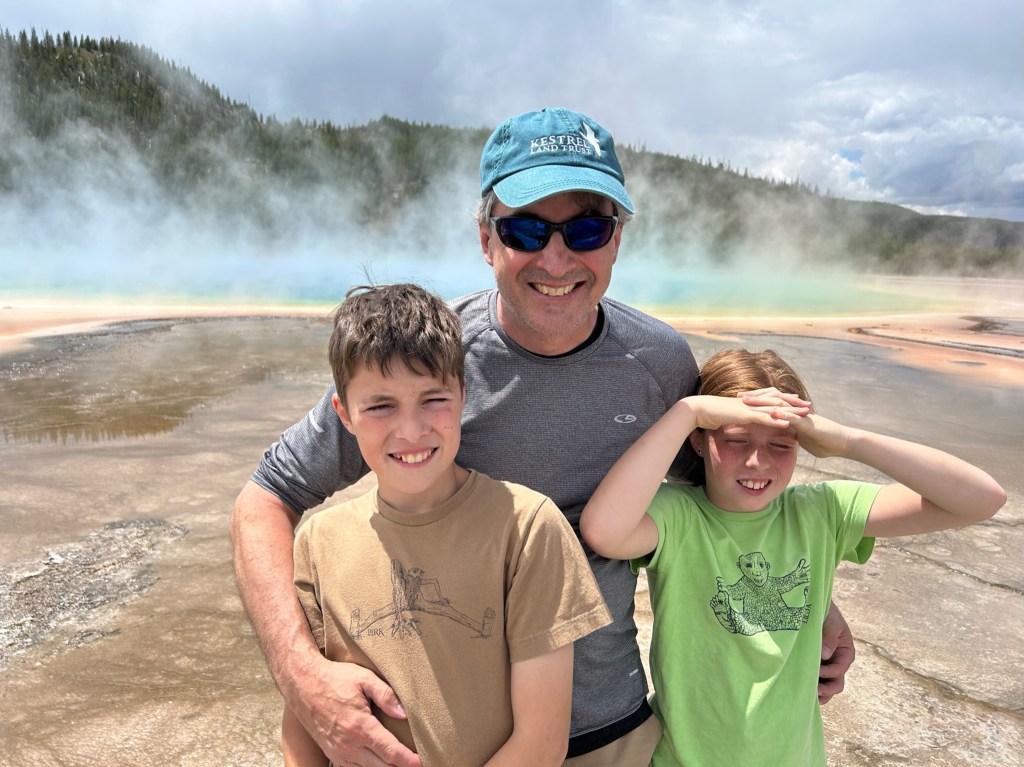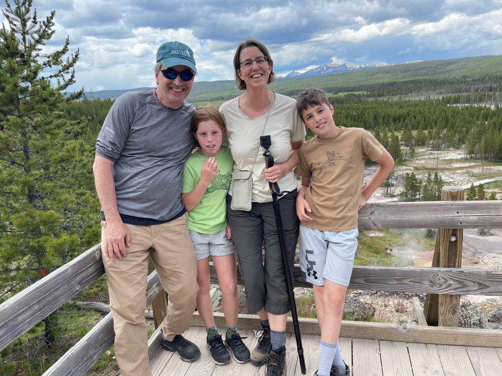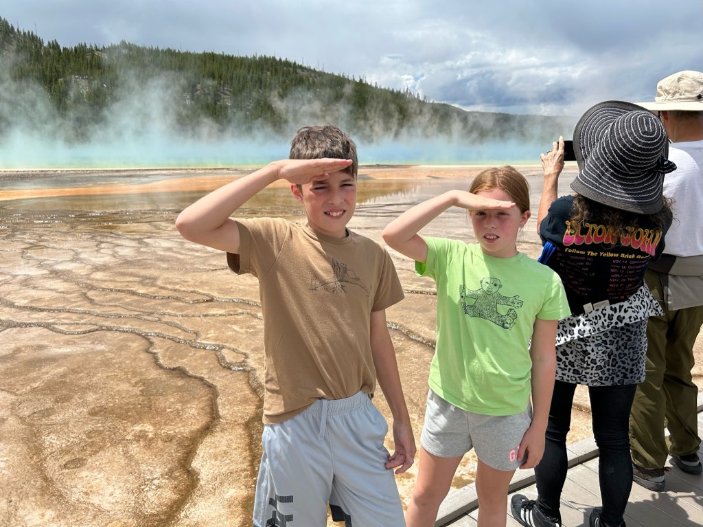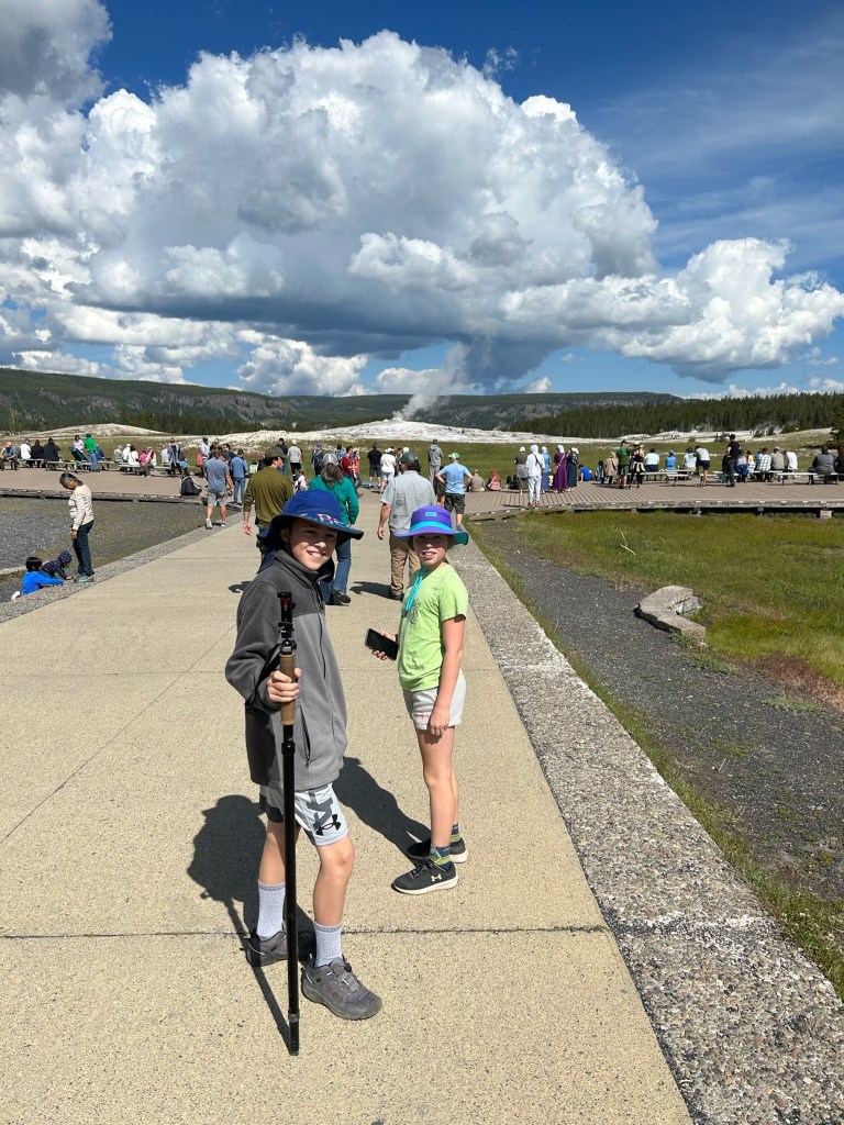 We decided to abandon our idea of hiking through the complex due to an approaching thunderstorm and chose instead to drive to Fairy Trail, where we encountered massive traffic and zero parking. We found a roadside spot at a 30 degree slope in our very tall camper in the pouring rain. We made and ate our lunch, carefully load balancing to not tip our camper over. The rain hadn’t completely abated but we hiked our way to the Grand Prismatic Overlook. The view was spectacular.