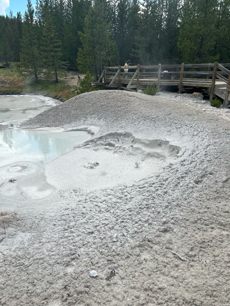 We continued driving north, hoping to stop at the Lower Geyser Basin but were dissuaded by the massive traffic jam and zero parking. We continued north on the Grand Tour loop road, finally stopping at the Artist’s Paint Pots, which didn’t disappoint, finally providing a view of actual bubbling mud pots, which Brady had been greatly anticipating.
