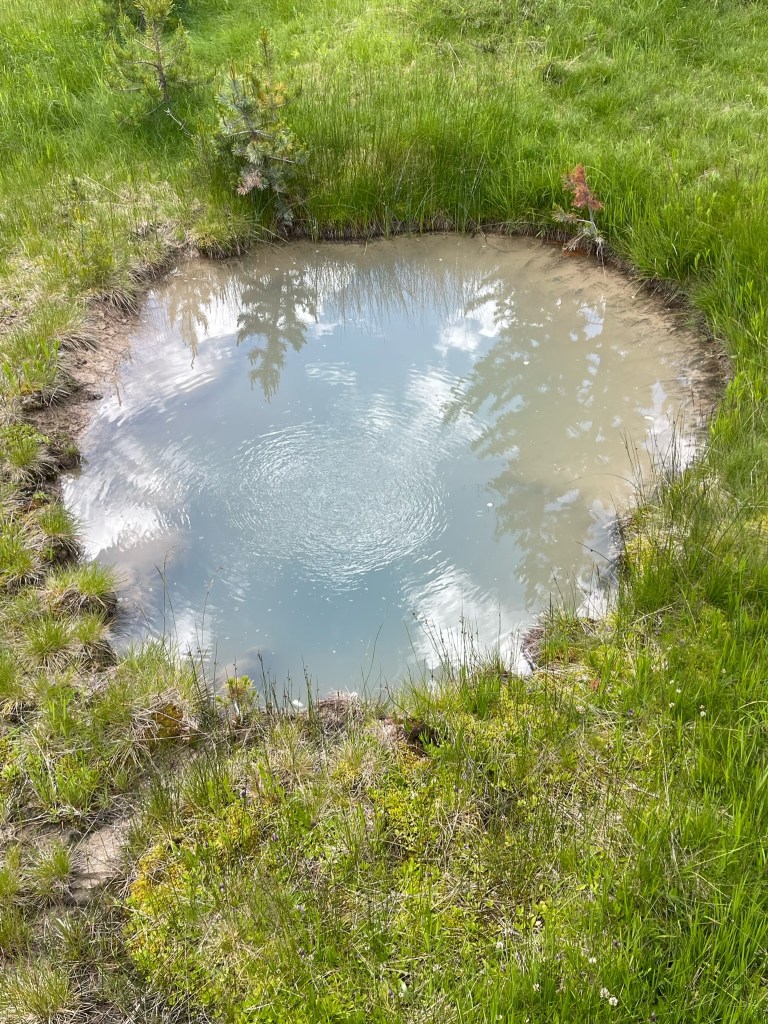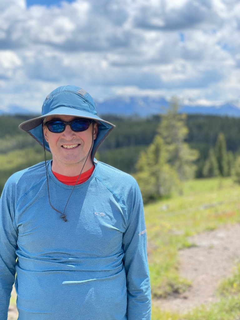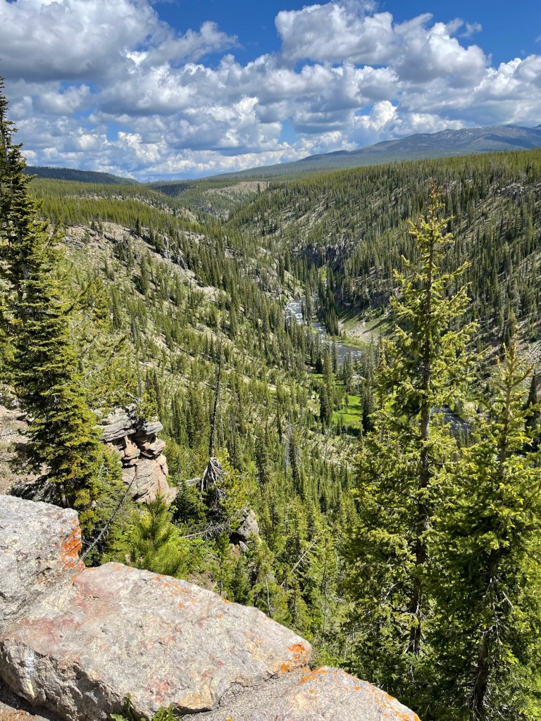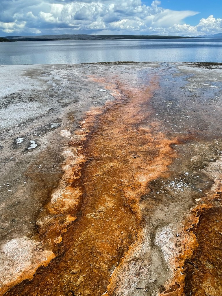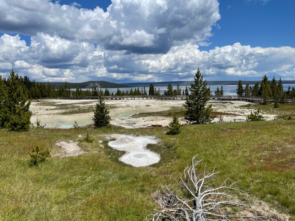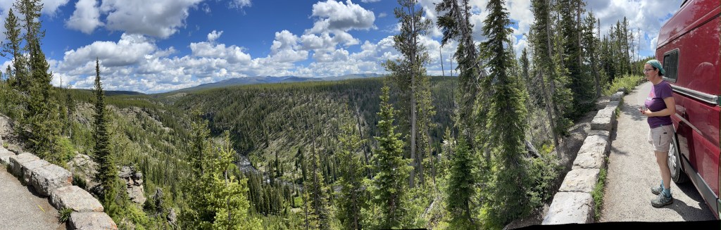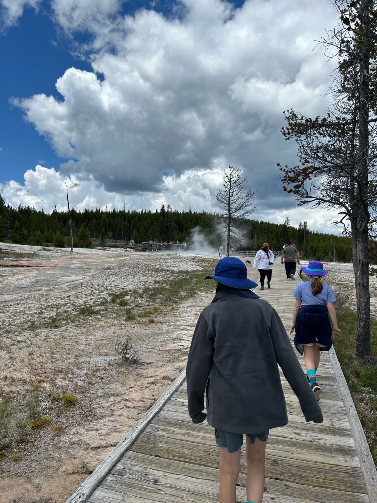 We decided to abandon our idea of hiking through the complex due to an approaching thunderstorm and chose instead to drive to Fairy Trail, where we encountered massive traffic and zero parking. We found a roadside spot at a 30 degree slope in our very tall camper in the pouring rain. We made and ate our lunch, carefully load balancing to not tip our camper over. The rain hadn’t completely abated but we hiked our way to the Grand Prismatic Overlook. The view was spectacular.