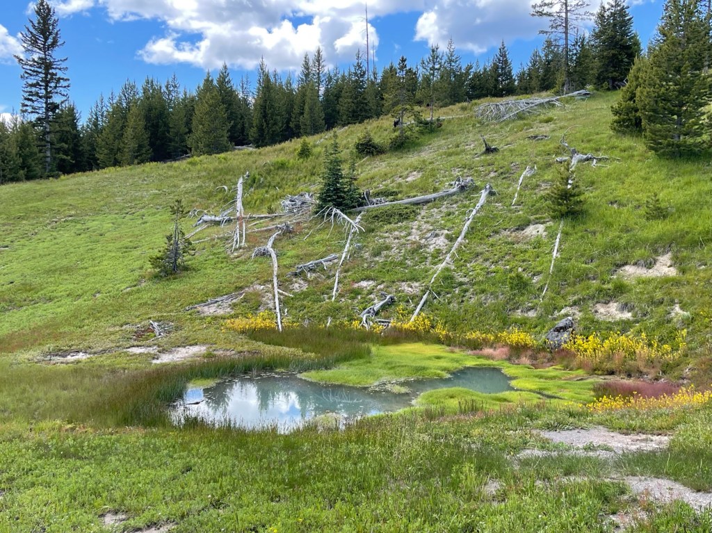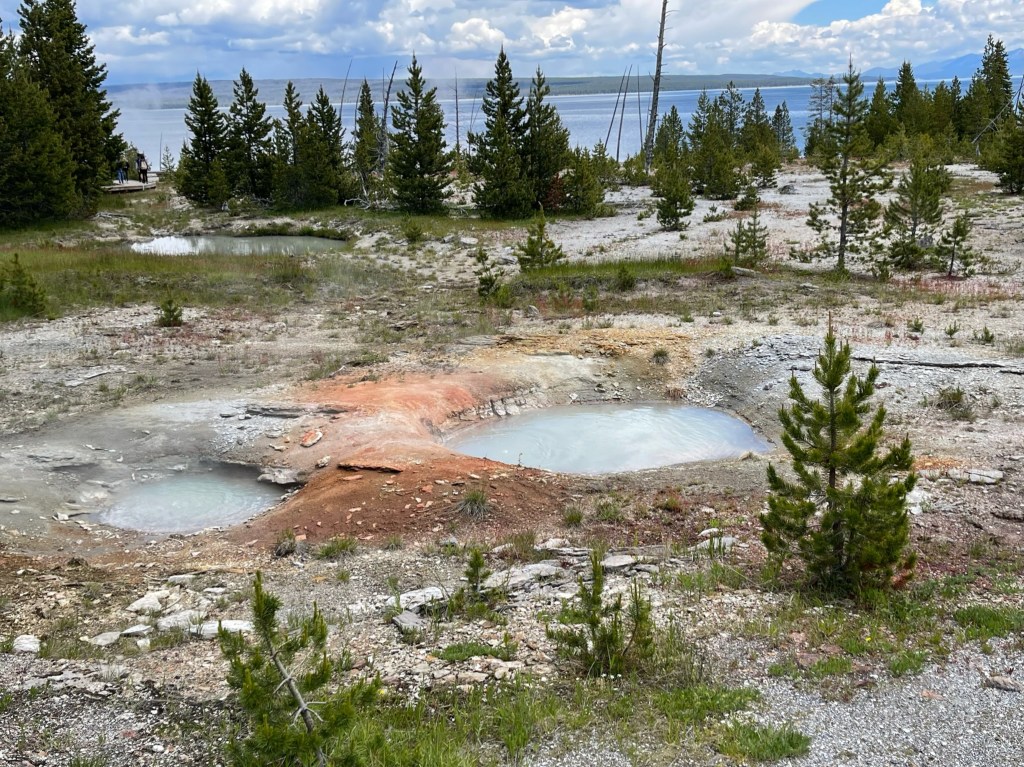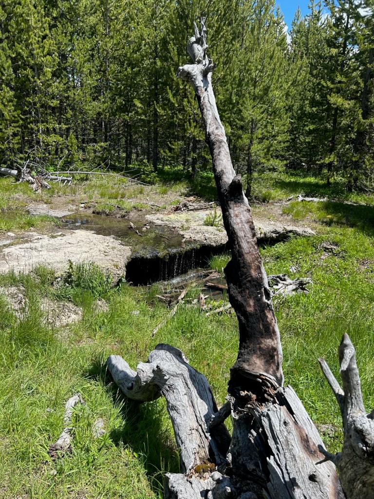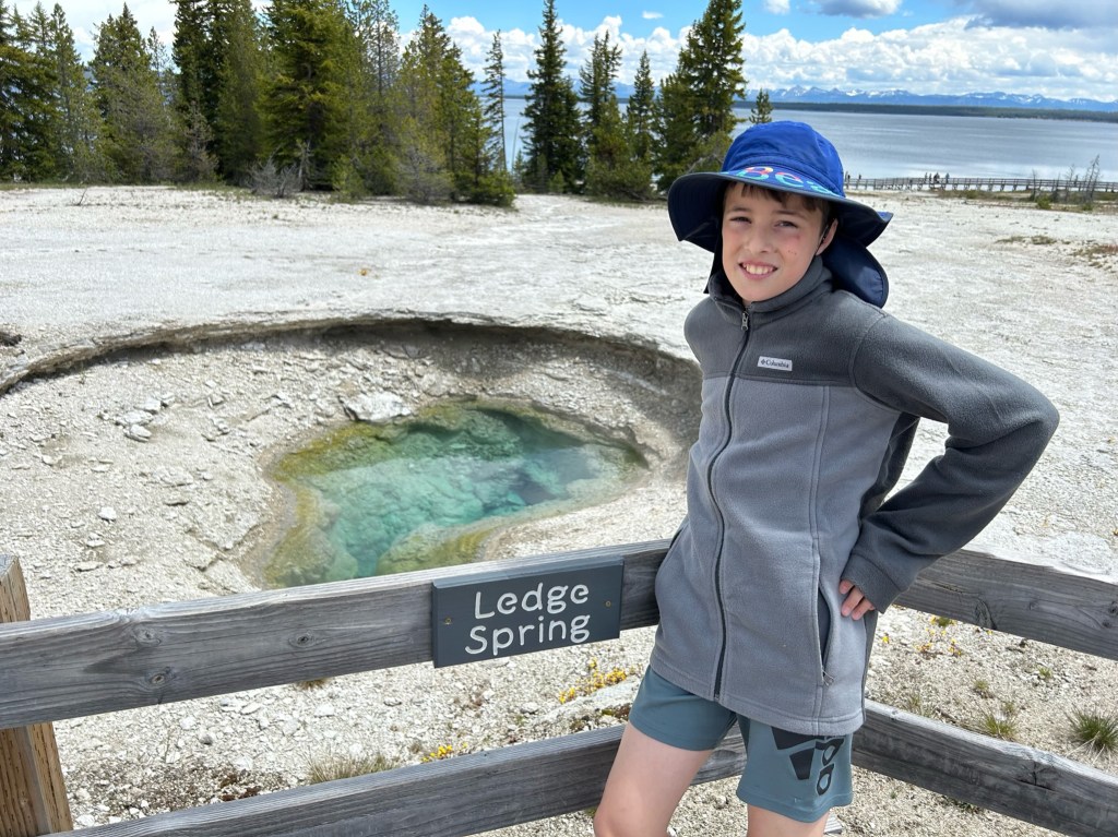 We continued driving north, hoping to stop at the Lower Geyser Basin but were dissuaded by the massive traffic jam and zero parking. We continued north on the Grand Tour loop road, finally stopping at the Artist’s Paint Pots, which didn’t disappoint, finally providing a view of actual bubbling mud pots, which Brady had been greatly anticipating.
