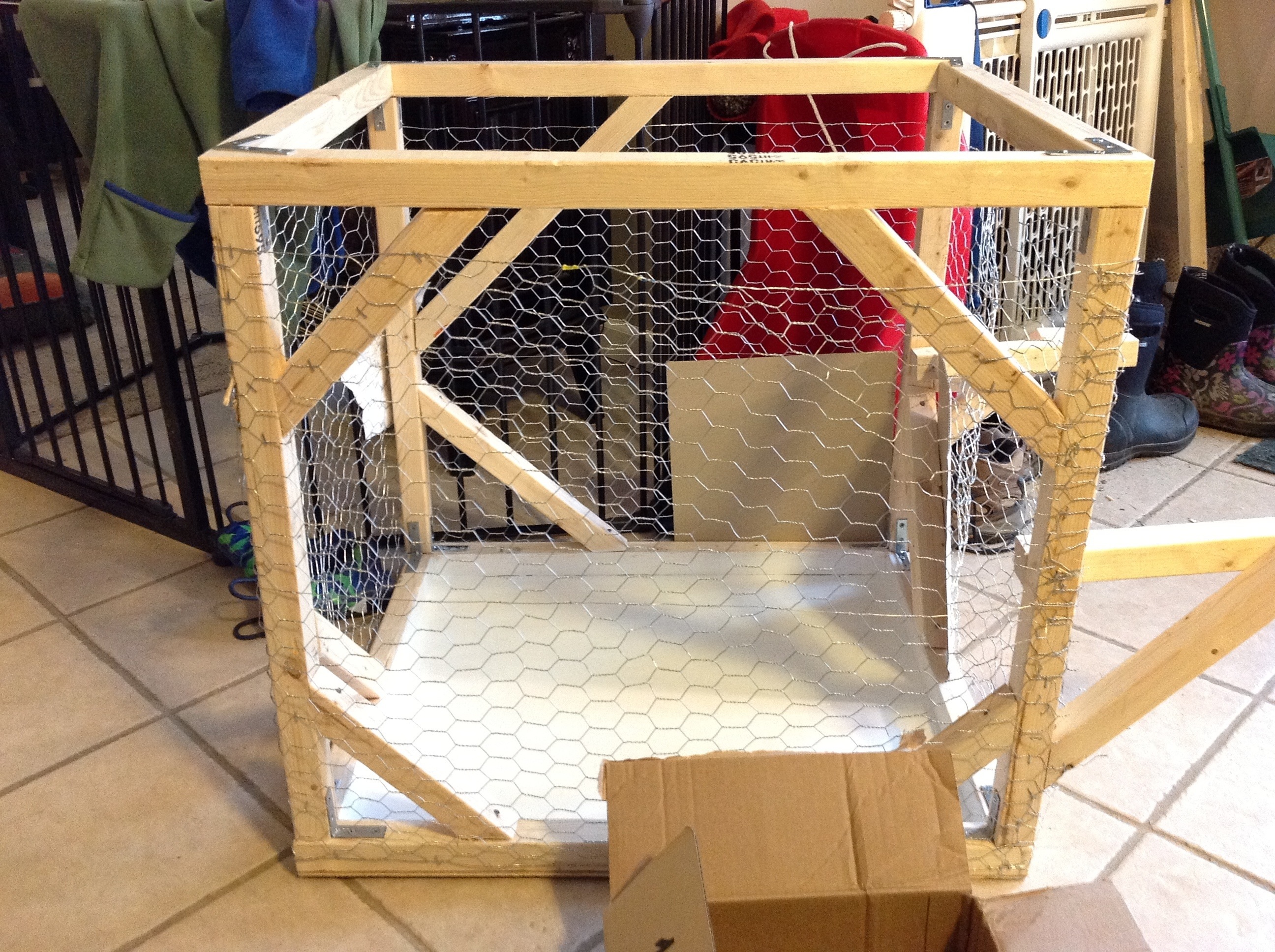 We have a friend who teaches elementary school, and each year she hatches chicks for her students. Last year we took three and raised them in the house until they were old enough to join the rest of the birds in the coop. We still have them, and 2 are reliable layers (the third turned out to be a rooster, alas). By and large this worked out great, except they made an unholy stink and mess in our basement. The stink faded quickly once we got the out, but the mess, a fine film of disgusto chicken dust* on everything, took a lot of work to clean up. This lead to an “over my dead body will we ever have chickens in the house again” proclamation from Susan. This year I wanted free chickens again, so I created this, for about $20: